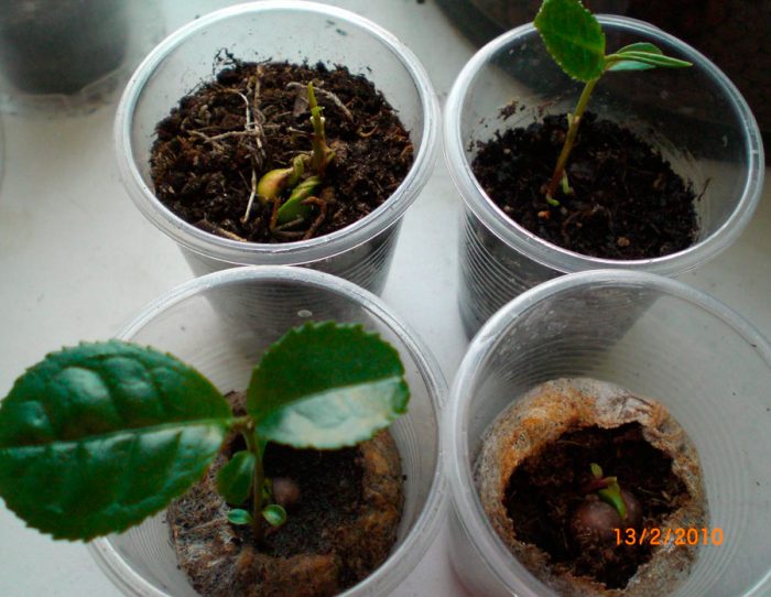 wysiew nasion odbywa się w doniczkach o średnicy 5 centymetrów. Wysiej nasiona po jednym w każdym pojemniku. Po pojawieniu się 2 prawdziwych liści zbiera się w większych doniczkach. Z reguły kamelie wyhodowane z nasion nie zachowują oznak rośliny rodzicielskiej, dlatego zaleca się rozmnażanie przez sadzonki.