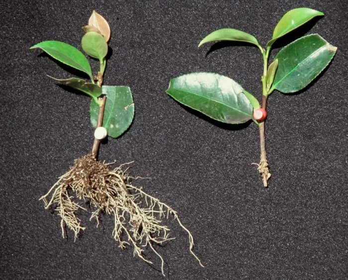 w przypadku, gdy łodyga jest bardzo słabo ukorzeniona, taka odmiana roślin jest rozmnażana przez szczepienie. Ta procedura powinna być przeprowadzana zimą w styczniu. Aby to zrobić, weź dobrze rozwinięte pąki ze szczytu łodygi. Następnie roślina musi być utrzymywana w temperaturze powietrza 20 stopni. Pąki wykiełkują po 8 tygodniach. Młode rośliny powinny być regularnie podlewane, spryskiwane, przycinane. W żadnym wypadku nie należy ich wystawiać na bezpośrednie działanie promieni słonecznych, ponieważ na liściach pojawią się oparzenia i opadną. Rok później Kamelia będzie musiała zostać przeszczepiona do doniczek o średnicy dziewięciocentymetrowej wypełnionych tą samą mieszanką ziemi. W 3 roku życia rośliny należy ostrożnie przenieść do doniczek o średnicy 11-14 centymetrów. Należy je wypełnić specjalną mieszanką gleby składającą się z darni, torfu, liści i wrzosu, a także piasku pobranego w stosunku 2:2:2:2:1.