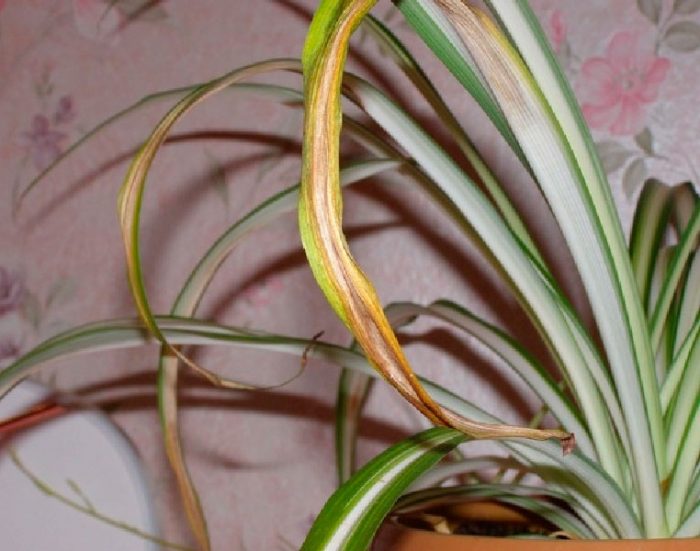 - liście brązowieją . Jeśli nawożenie podłoża nie jest regularne lub w niewystarczającej objętości, z tego powodu końcówki liści chlorophytum mogą stać się brązowe. Może się to również zdarzyć z powodu zbyt niskiej wilgotności powietrza, zbyt wysokich temperatur lub uszkodzeń mechanicznych.