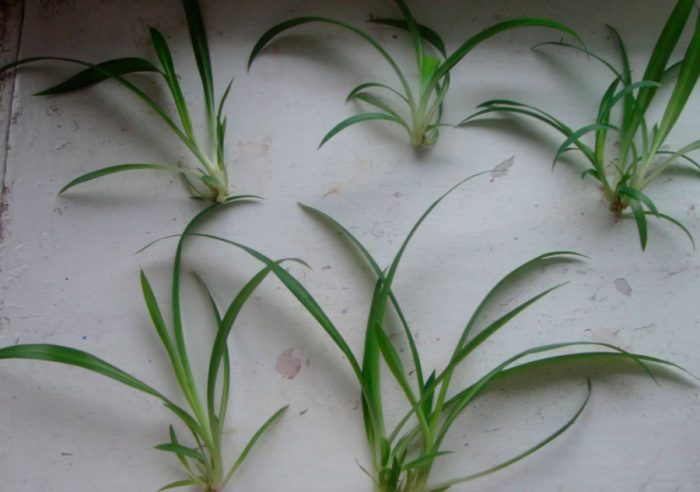 pierwsze sadzonki powinny pojawić się po 3-6 tygodniach. Kiedy tak się stanie, musisz zacząć przyzwyczajać roślinę do życia bez schronienia, w tym celu szkło jest codziennie usuwane przez pewien czas, a czas trwania procedury jest stopniowo zwiększany. Po utworzeniu od 2 do 4 prawdziwych blaszek liściowych na sadzonkach, są one zbierane w osobnych małych doniczkach. A wyhodowane i wzmocnione rośliny sadzi się w mieszance gleby dla dorosłych chlorophytums (patrz wyżej).