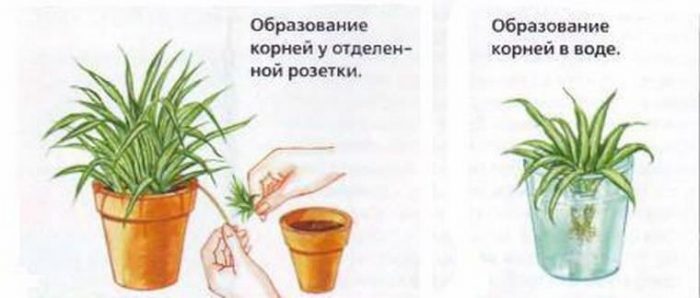 u niektórych gatunków chlorophytum uprawianych w warunkach pokojowych na szypułkach tworzą się warstwy, które są rozetami liści. W razie potrzeby można je odciąć i ukorzenić w pojemniku z wodą lub podłożem. Następnie roślina jest przesadzana do indywidualnej doniczki.